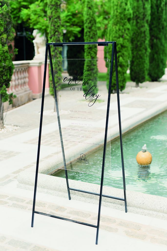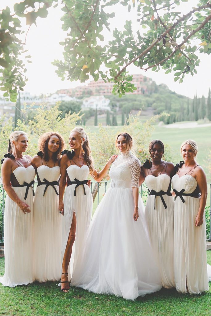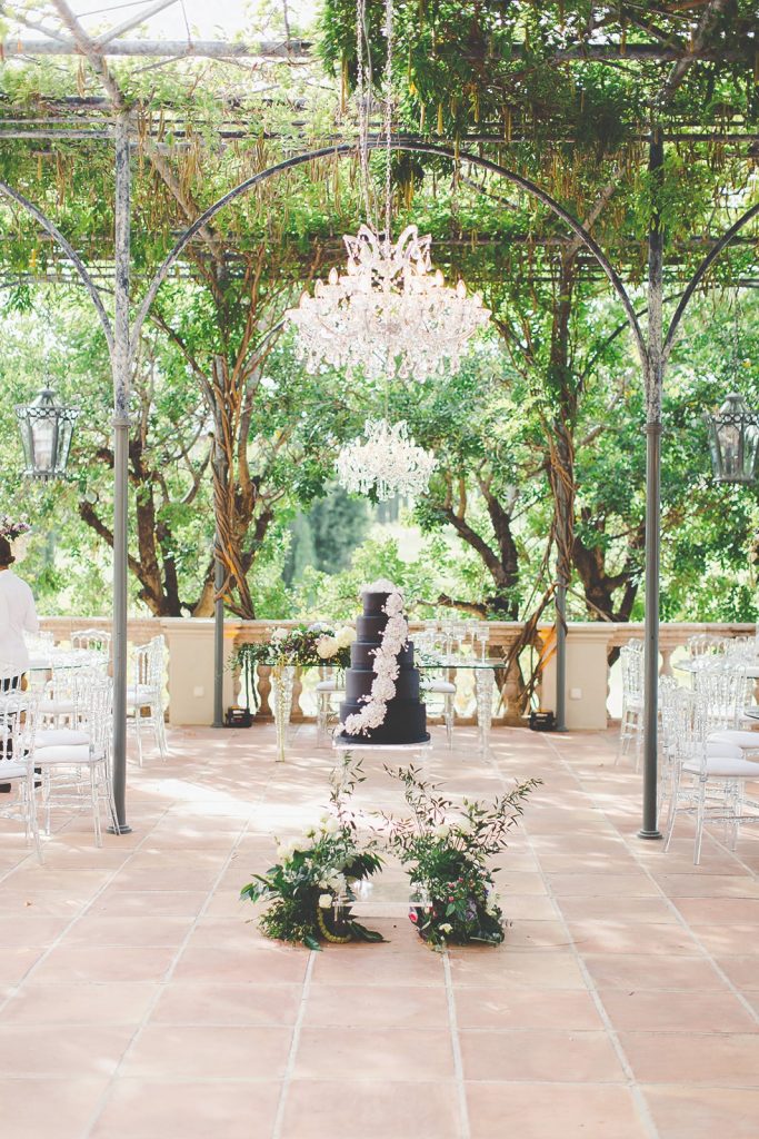 I decori sono minimali per un effetto volutamente sobrio, piacevole e raffinato. La luce è una componente importantissima, che esalta ancora di più l’utilizzo dominante del colore bianco, presentato in contrasto con il nero, proposto nelle giuste dosi per un risultato leggero. Un accostamento di cromie studiato per piacere alla vista, una scelta anticonvenzionale per un risultato assolutamente chic. Dal cartello di benvenuto ai dettagli degli abiti delle damigelle, il nero conferisce un aspetto lussuoso e ricco. Il tutto ancora più amplificato dalla scelta della torta nuziale su più piani in total black.