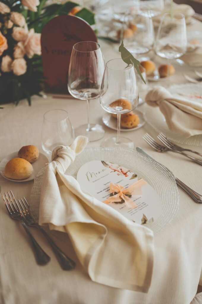 Come il tableau, anche i segnatavolo sono realizzati in velluto inciso, su due strati. Invece i segnaposti raffigurano cocorite e pappagallini coloratissimi, che appoggiati delicatamente sui calici sembrano volare liberi e felici nella stanza. Un’idea originalissima per un matrimonio in tema tropicale curato nei dettagli.