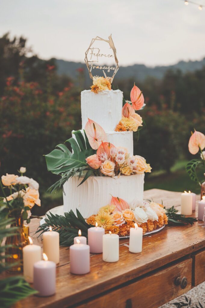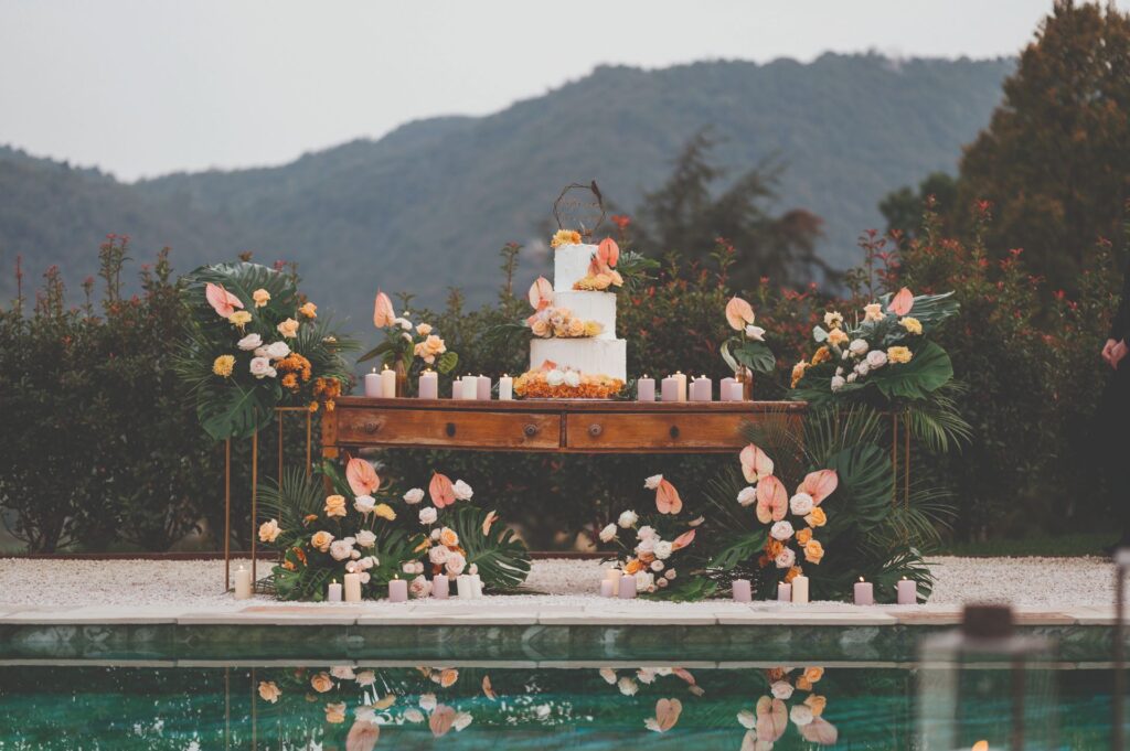 Il taglio della torta nuziale a bordo piscina ha conquistato tutti i presenti; il colore arancione domina la scenografia per un effetto ricercato e originale, enfatizzato dal calore delle tantissime candale che scaldano l’atmosfera. Il cake topper svetta su questa torta a tre piani, con il dettaglio cocorita, fil rouge dell’intero evento.