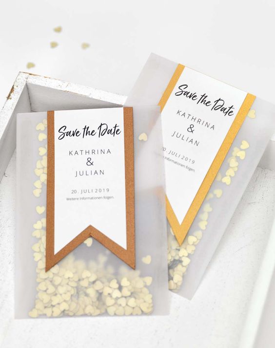 Il save the date precede le partecipazioni e gli inviti di nozze, anticipando solo qualche breve informazione chiave, come il nome degli sposi, la data del matrimonio e la città in cui si celebreranno le nozze.