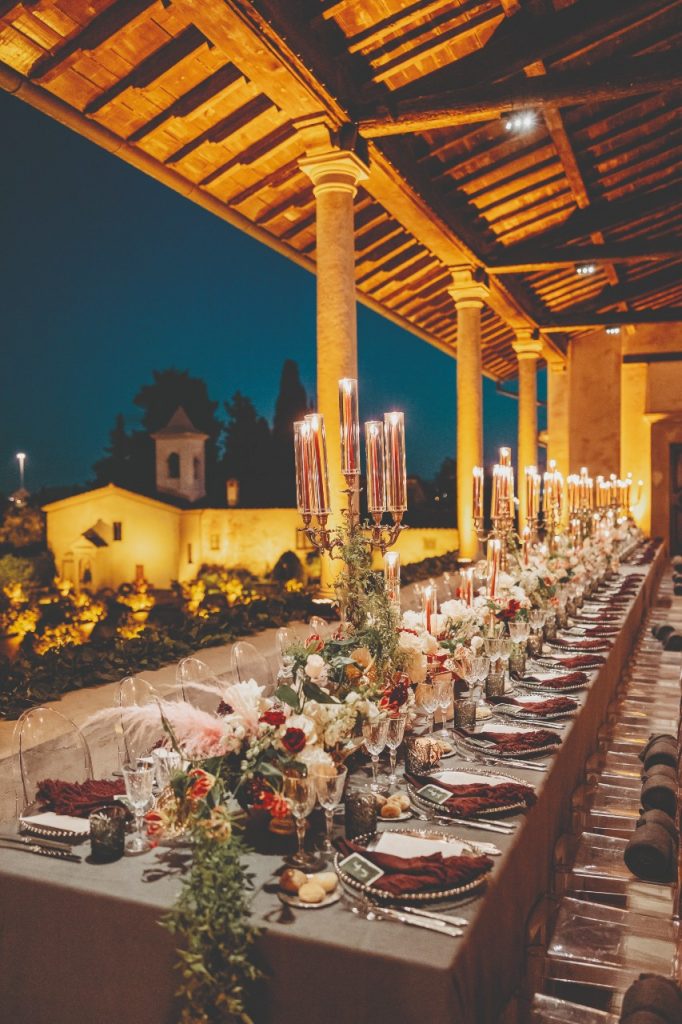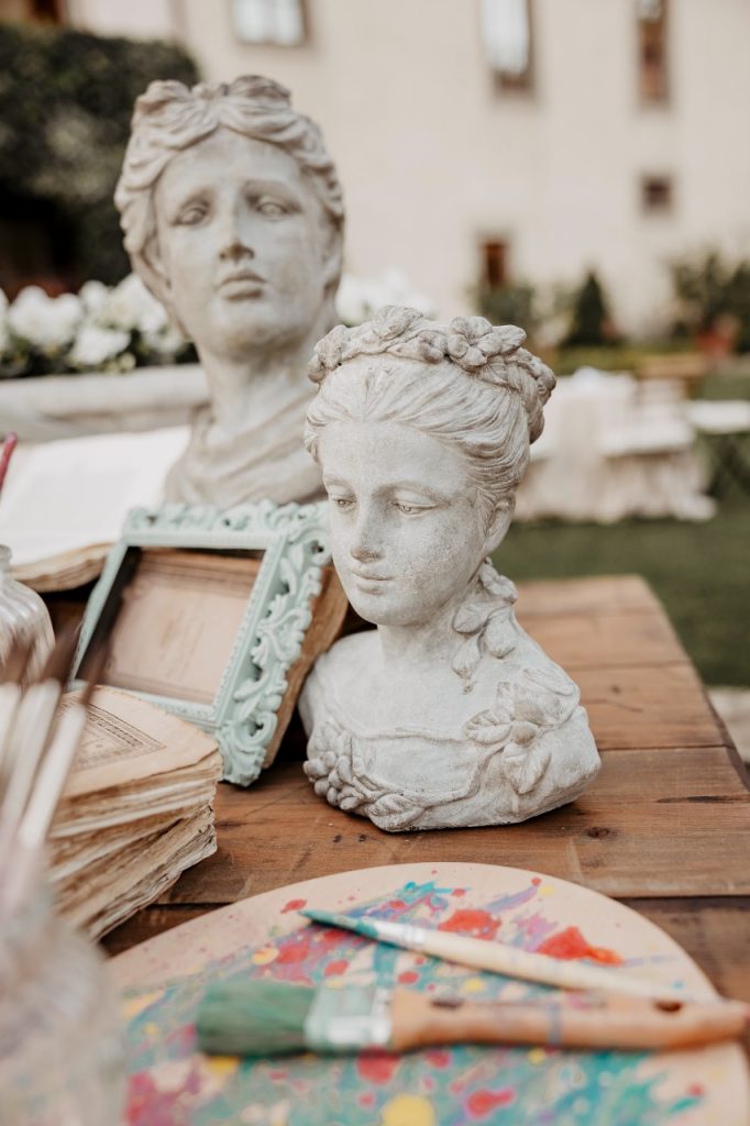 A seguire, il bellissimo ricevimento a Villa Pazzi al Parugiano, meravigliosa location alle porte del capoluogo toscano dove l’arte è protagonista: dal table decor con la presenza di mezzi busti ai segnaposto-pennello, fino ai camerieri che servono food e vino utilizzando cornici anziché i classici vassoi.