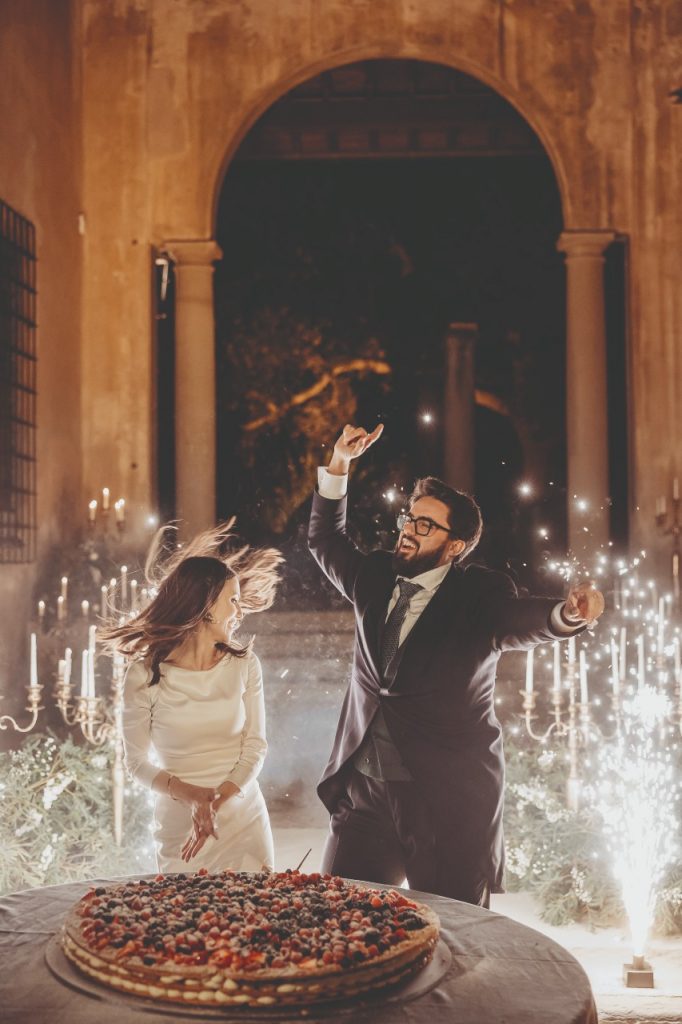 Il glamour caratterizza invece il party, pensato come se fosse l’evento di una sfilata di moda di Pitti negli anni Novanta. Spazio ai dettagli per stupire gli ospiti: dai cocktail più famosi serviti con le caramelle gommose all’allestimento con vecchi lampadari di cristallo appesi o appoggiati a terra, ai lati pile di riviste di moda e, infine, la pista da ballo con una mirror ball perfetta per ricreare l’atmosfera da sogno che Katheryna e Miguel tanto desideravano.